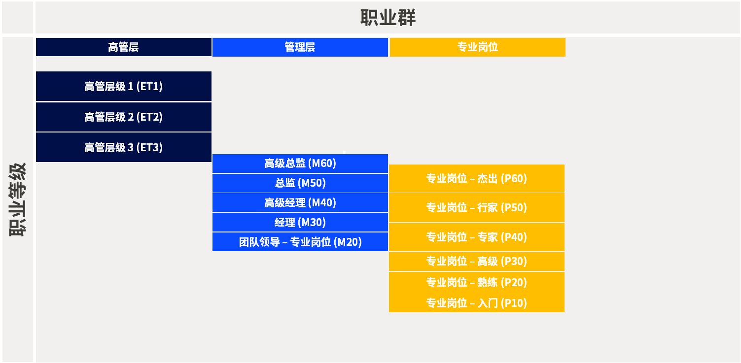 注释: 此表仅用来表示美世全球岗位库的职业群中职业等级之间的典型相关性。它是基于一家中型规模组织的国际职位评估(IPE)结果所得出的职位等级中位值建立的对应关系。不同组织的职业等级对应关系会根据多种因素发生变化,特别是组织规模,以及所在行业、营业活动、地域范围等。如果需要更多信息,请咨询您的美世顾问。