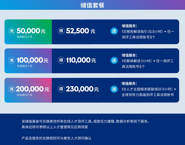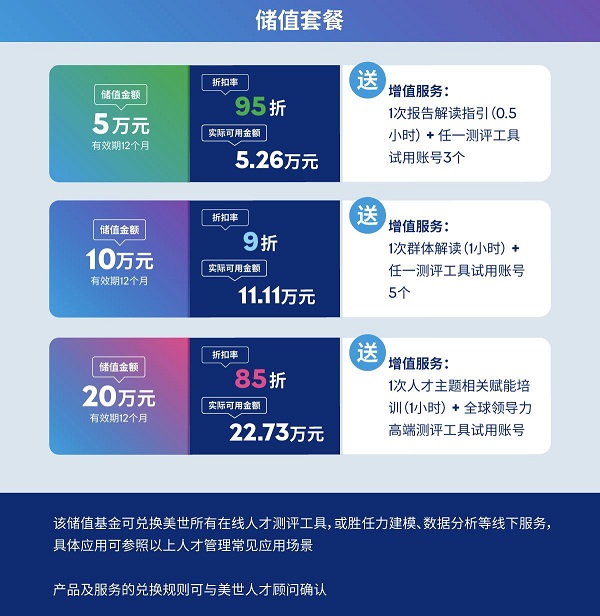 该储值基金可兑换美世所有在线人才测评工具,或胜任力建模、数据分析等线下服务,具体应用可参照以上人才管理常见应用场景 产品及服务的兑换规则可与美世人才顾问确认 |