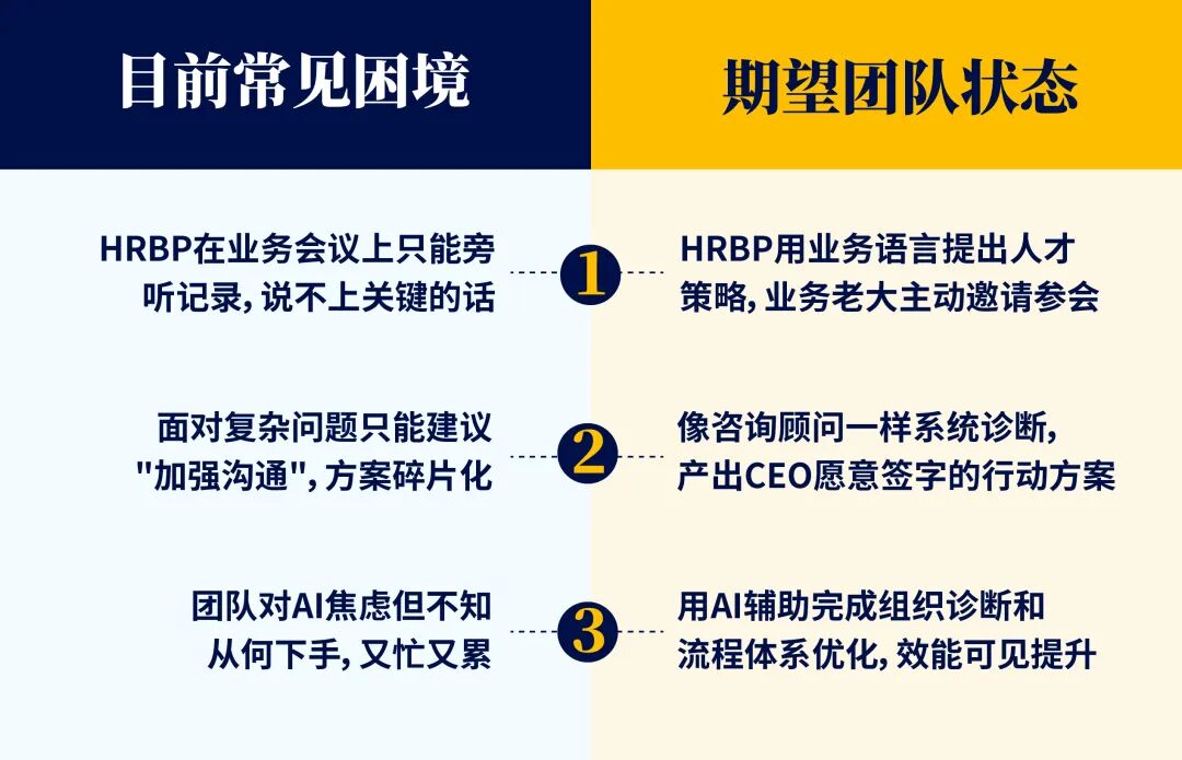 适合对象: 追求前沿生产力、希望通过AI技术实现价值重塑的先锋HR团队。 核心内容: 建立AI高阶认知,手把手实战AI辅助方案设计(涵盖组织诊断与设计、职位体系优化、绩效指标协同、任职资格开发、智能人才招募与企业文化落地等场景)。掌握AI应用的底层思维与方法,构建从组织到人才的AI增强型工作流。